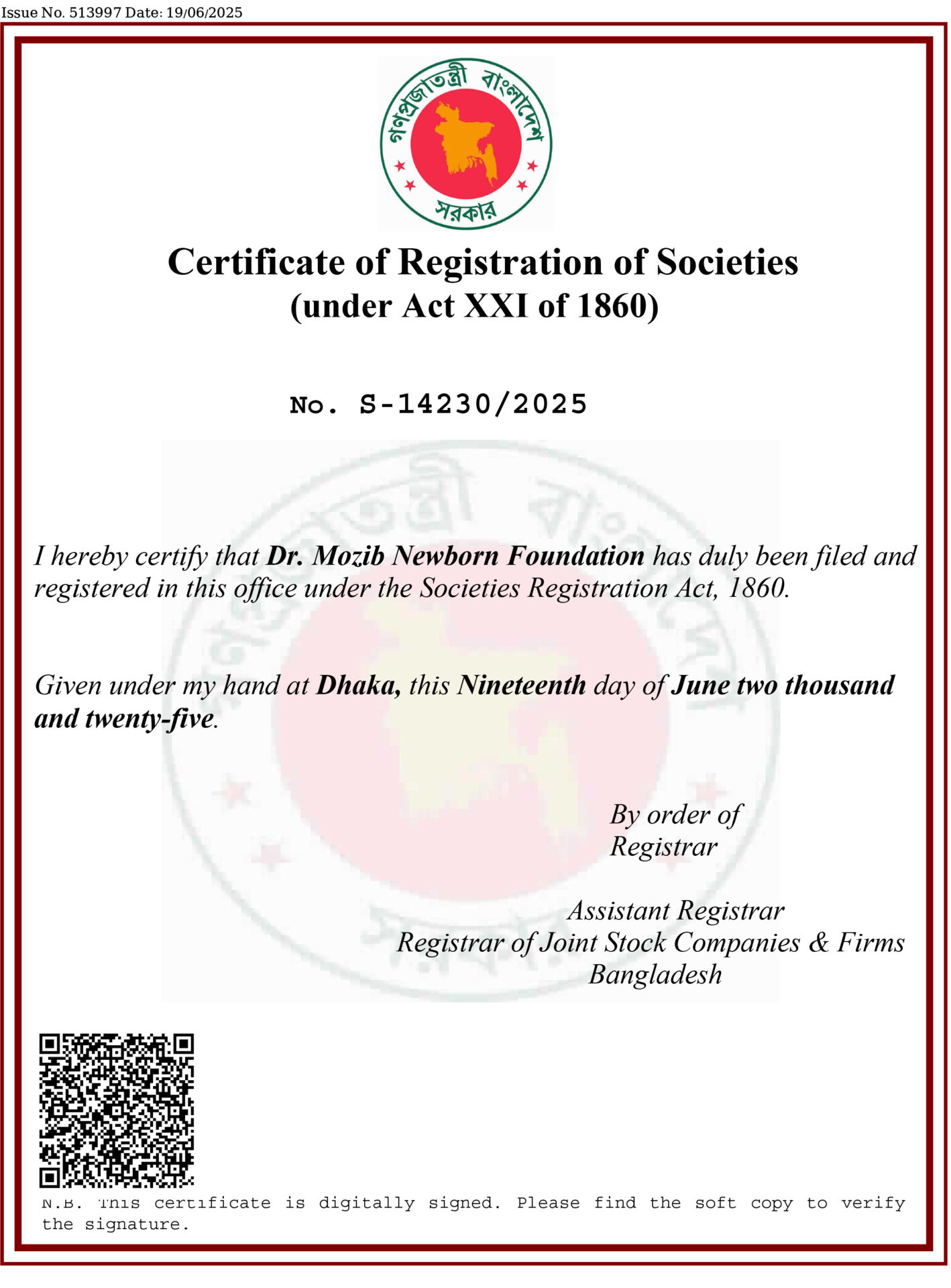 Dr. Mozib Newborn Foundation champions for social recognition of abandoned newborn babies. Ensuring every newborn is valued as an equal member of humanity. We provide critical medical care, legal aid, and foster placement while advocating for systemic change to integrate these newborns into society’s mainstream. Our mission is to transform neglect into dignity, fostering a world where every newborn’s right to safety, love, and belonging is a collective human responsibility. By uniting communities and institutions, we strive to erase stigma and ensure no newborn begins life unseen—because every life deserves to thrive at the heart of human compassion and progress.